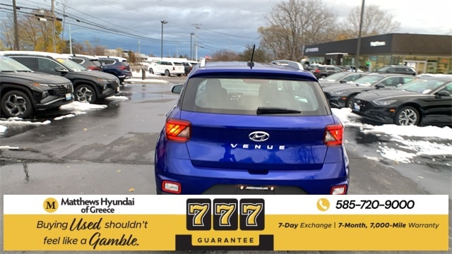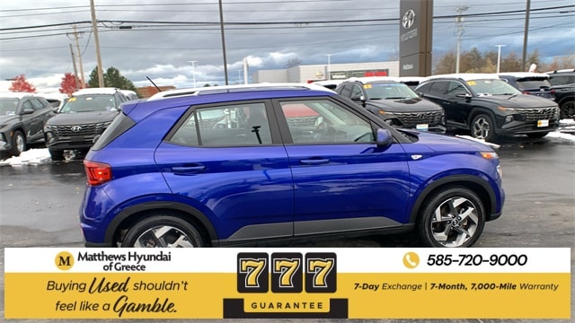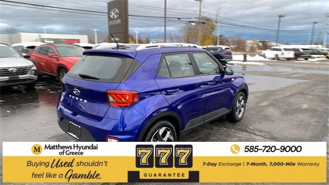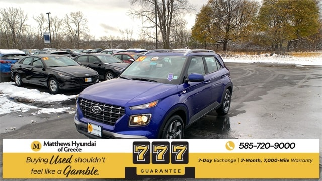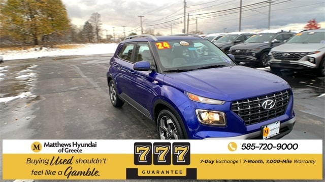 Certified. Intense Blue 2024 Hyundai Venue SEL FWD CVT I4 4-Wheel Disc Brakes, 6 Speakers, 6.052 Axle Ratio, 6.5J x 17" Alloy Wheels, ABS brakes, Air Conditioning, Alloy wheels, AM/FM radio, Apple CarPlay & Android Auto, Auto High-beam Headlights, Automatic temperature control, Brake assist, Bumpers: body-color, Cargo Tray, Cloth Seat Trim, Delay-off headlights, Driver door bin, Driver vanity mirror, Dual front impact airbags, Dual front side impact airbags, Electronic Stability Control, Front anti-roll bar, Front Bucket Seats, Front Center Armrest, Front reading lights, Front wheel independent suspension, Fully automatic headlights, Illuminated entry, Leather Shift Knob, Leather steering wheel, Low tire pressure warning, Occupant sensing airbag, Option Group 01, Outside temperature display, Overhead airbag, Overhead console, Panic alarm, Passenger door bin, Passenger vanity mirror, Power door mirrors, Power moonroof, Power steering, Power windows, Radio: AM/FM/HD Display Audio, Rear Seat Cup Holder, Rear window defroster, Rear window wiper, Remote keyless entry, Roof rack: rails only, Security system, Speed control, Speed-sensing steering, Split folding rear seat, Spoiler, Steering wheel mounted audio controls, Tachometer, Telescoping steering wheel, Tilt steering wheel, Traction control, Trip computer, Variably intermittent wipers.