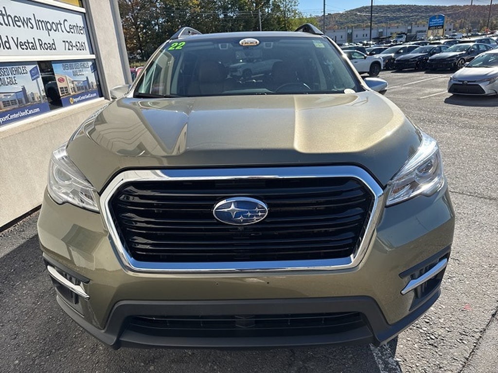 Certified. Green Metallic 2022 Subaru Ascent Touring AWD Lineartronic CVT 2.4L 4-Cylinder DOHC 16V20/26 City/Highway MPGSubaru Certified Pre-Owned Details: * Warranty Deductible: $0 * Vehicle History * Powertrain Limited Warranty: 84 Month/100000 Mile (whichever comes first) from original in-service date * 152 Point Inspection * Roadside Assistance * SiriusXM 3-Month trial subscription $500 Owner Loyalty coupon & 1 year trial subscription to STARLINK * Transferable WarrantyMatthews Import Center promises each customer a thorough and confident 120-point inspection on our used inventory guaranteeing a relaxing and peace-of-mind experience. We are located behind Lowes in Vestal NY. Or call us at (607) 729 - 6261 Matthews Import Center 3013 Old Vestal Road Vestal NY 13850.