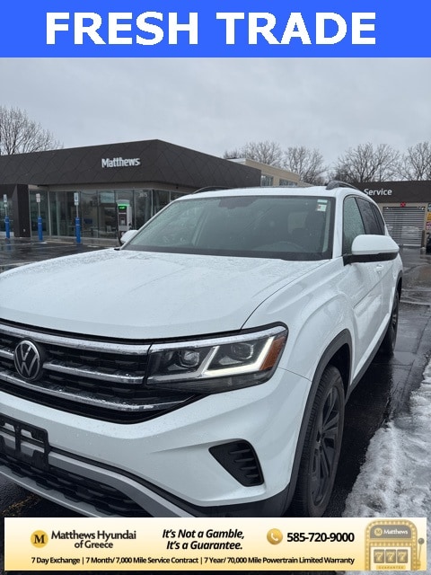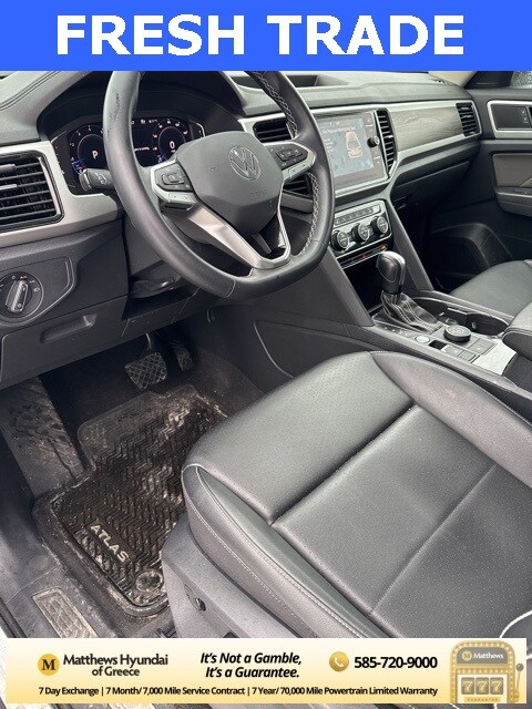 Pure White 2023 Volkswagen Atlas 3.6L V6 SE w/Technology AWD 8-Speed Automatic with Tiptronic 3.6L VR6 3.60 Axle Ratio, 3rd row seats: split-bench, 4-Wheel Disc Brakes, 6 Speakers, ABS brakes, Air Conditioning, Alloy wheels, AM/FM radio: SiriusXM with 360L, Auto-Dimming Rear-View Mirror, Auto-dimming Rear-View mirror, Automatic temperature control, Black Wheel Package, Brake assist, Bumpers: body-color, Compass, Delay-off headlights, Driver door bin, Driver vanity mirror, Dual front impact airbags, Dual front side impact airbags, Electronic Stability Control, Emergency communication system: VW Car-Net Safe & Secure 5-year, Exterior Parking Camera Rear, Four wheel independent suspension, Front anti-roll bar, Front Bucket Seats, Front Center Armrest, Front dual zone A/C, Front fog lights, Front reading lights, Fully automatic headlights, Heated Comfort Front Bucket Seats, Heated door mirrors, Heated front seats, Heavy Duty Trunk Liner w/VW CarGo Blocks, Illuminated entry, Leather Shift Knob, Low tire pressure warning, Occupant sensing airbag, Outside temperature display, Overhead airbag, Overhead console, Panic alarm, Panoramic Sunroof Package, Passenger door bin, Passenger vanity mirror, Perforated V-Tex Leatherette Seating Surfaces, Power door mirrors, Power driver seat, Power Liftgate, Power steering, Power Tilting & Sliding Panoramic Sunroof, Power windows, Radio data system, Radio: MIB3 Composition Media w/8" Touchscreen, Rain sensing wipers, Rear air conditioning, Rear anti-roll bar, Rear reading lights, Rear seat center armrest, Rear window defroster, Rear window wiper, Remote keyless entry, Rubber Mats Kit - Bench Seats, Security system, Speed control, Speed-sensing steering, Split folding rear seat, Spoiler, Standard Suspension, Steering wheel mounted audio controls, Tachometer, Telescoping steering wheel, Tilt steering wheel, Traction control, Trip computer, Turn signal indicator mirrors, Variably intermittent wipers, Wheels: 20" x 8J 5-Spoke Black Painted Alloy, Wheels: 20" x 8J 5-Spoke Silver Painted Alloy.